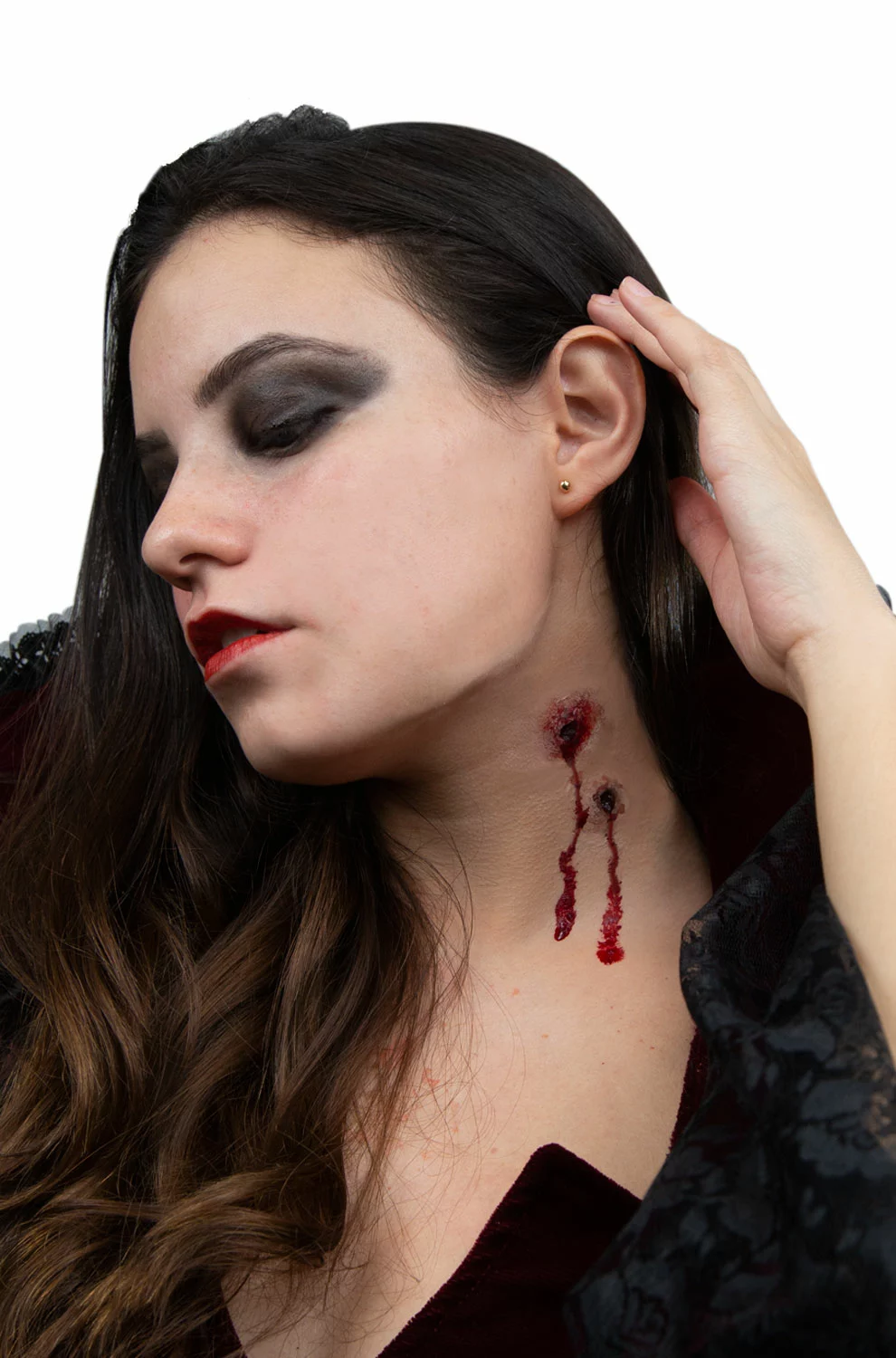 Add some creepy realism to your vampire bride costume this Halloween with this Vampire Bites prosthetic. Add some vampire fangs and your friends will believe that you are a baby vampire on the prowl for fresh meat. They better watch out, or they may be your first victim!