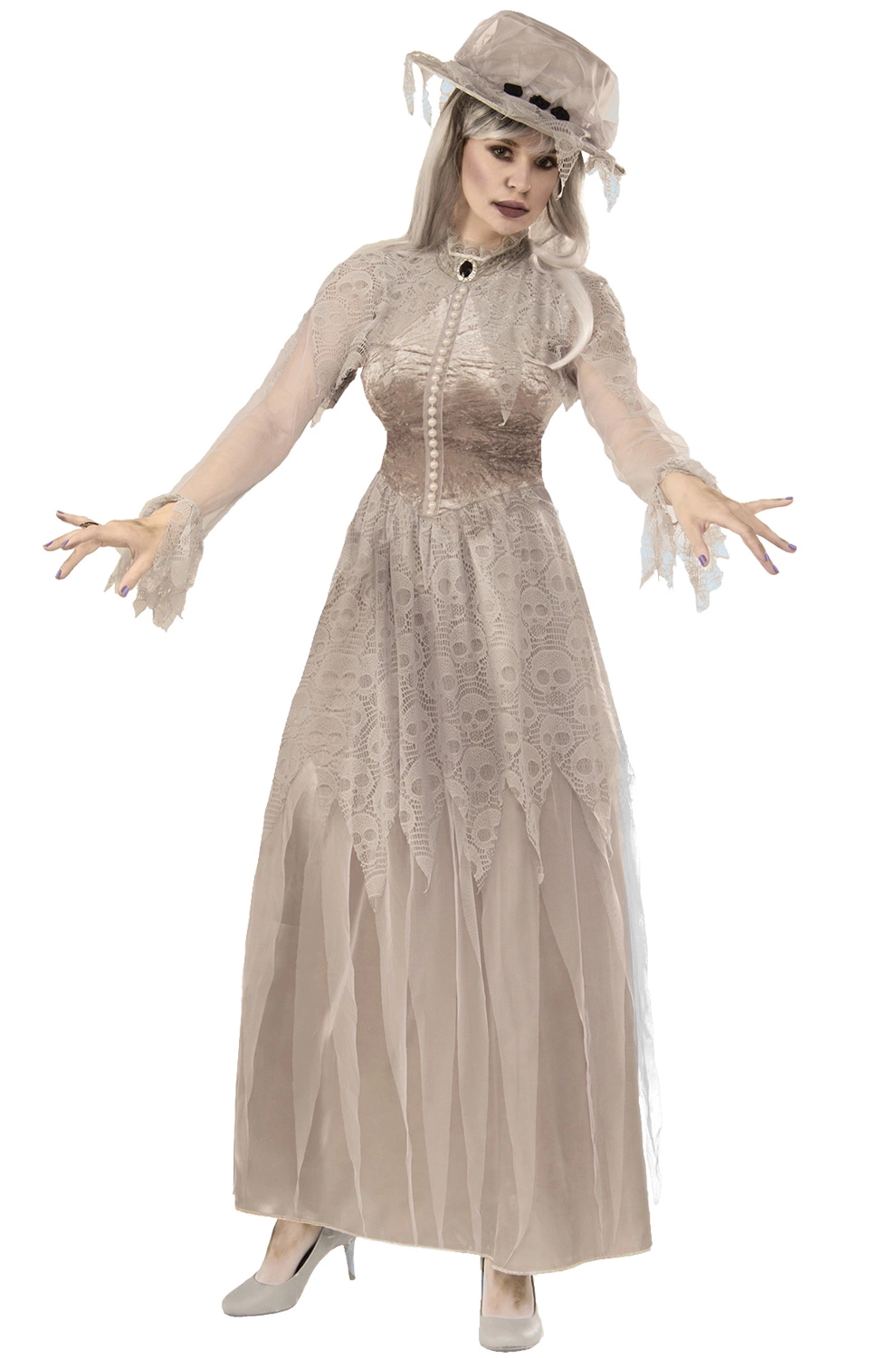 This Victorian ghost is looking to haunt everyone that crosses her path. She’s been wronged and is looking to take out her revenge on anyone and everyone. Transform into this hauntingly scary spirit with this costume for women which includes a tattered grey Victorian gown featuring skull patterned lace and adorned with faux pearl beading and a matching grey hat.
